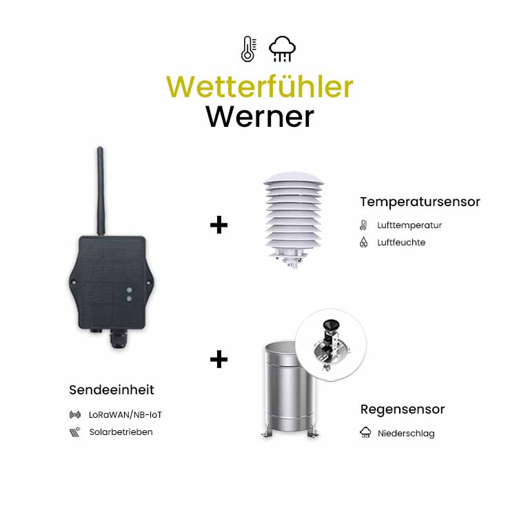 Mit Werner, unserem vielseitigen Wetterfühler, bist du immer bestens über die aktuellen Wetterbedingungen auf deinem Feld informiert. Er misst den Niederschlag, die Lufttemperatur und die Luftfeuchtigkeit – unverzichtbare Daten, um deine landwirtschaftlichen Entscheidungen optimal zu steuern.